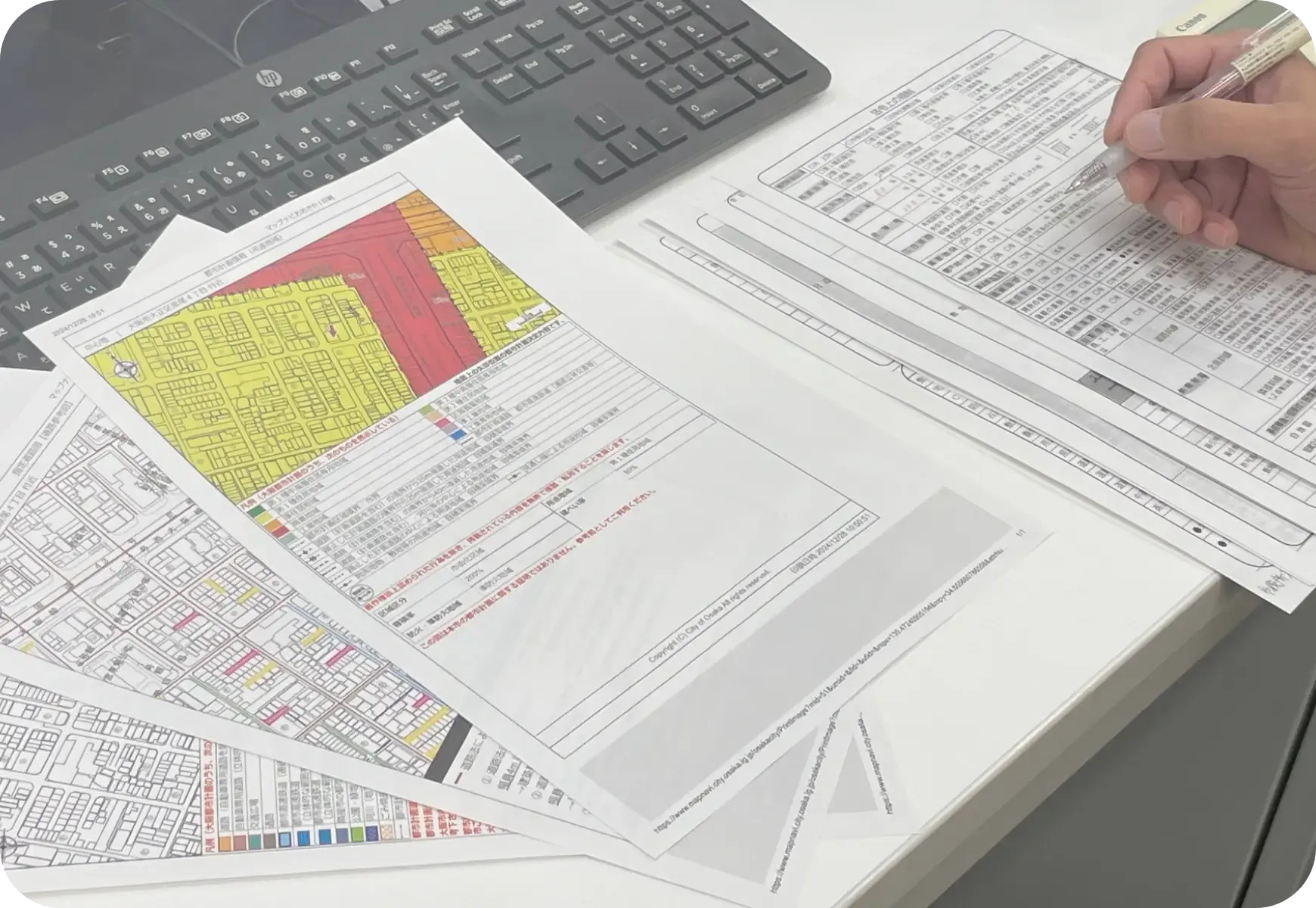 - 役所で書面・図面を取得して、土地や道路に対する法令上の制限やインフラ状況などについて調べて報告書にまとめ納品します。