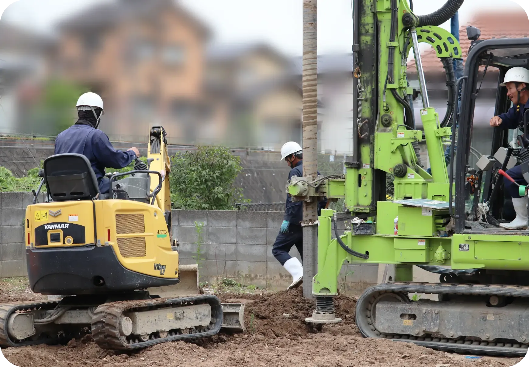 - 地盤調査で判明した軟弱地盤を強化し、建物を安全に支えるための重要な工事です。適切な改良工法で地盤の強度と安定性を向上させ、建物の沈下や傾斜のリスクを防ぎます。
