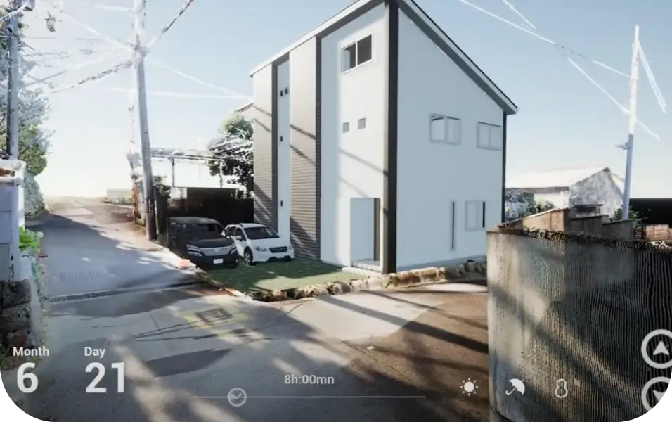 デジタルツインサービス『ARパース』も付加価値提供しており、建築パースを点群データの中に取り込み、周囲環境との干渉や全体の調和を見ながらリアルな日照シミュレーションが可能です(個人のPCやタブレットでも操作可能)。
